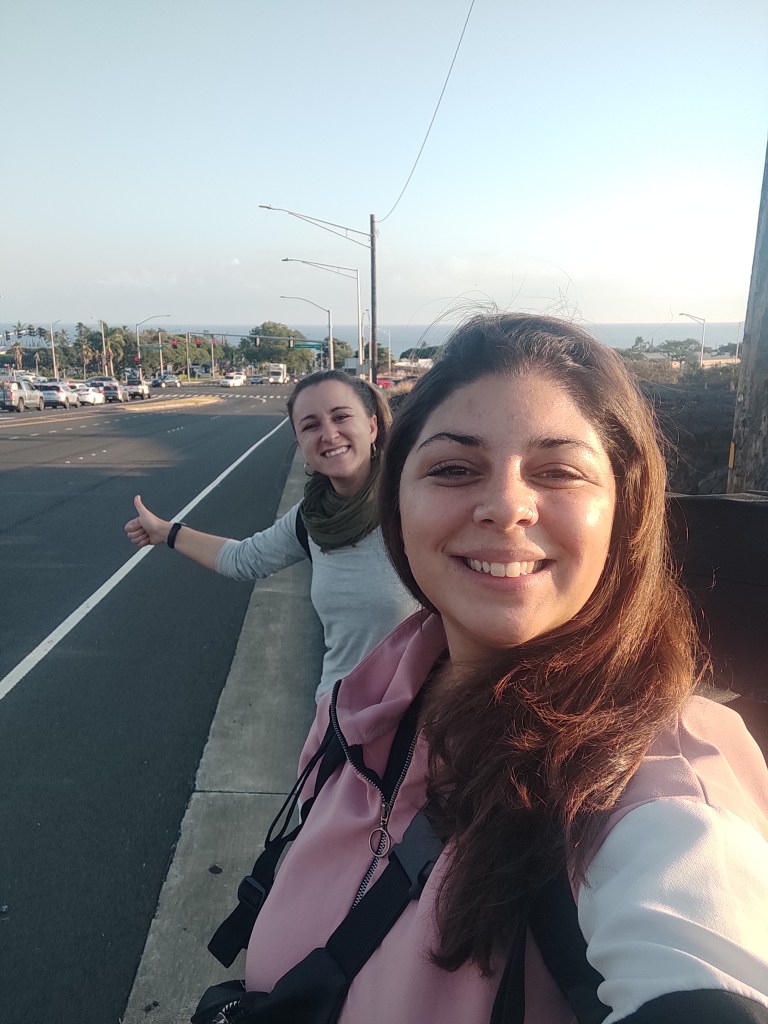 Seguíamos haciendo dedo con la vista del mar en frente . Entonces dijimos. ¿si mejor vamos a la playa y nos tomamos el bus de las 11? Claro que sí. Allá fuimos con mochilas a cuestas pero felices de poder estrenar ese mar hawaiano.
