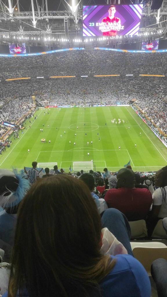 El partido fue para el infarto, ya lo sabemos todos. Una final realmente épica. Y gracias a que me cambié de lugar en el estadio, pude ver al dibu atajar ese primer penal, ahí atrás del arco; ver a Messi levantar la copa con esa «capa» de rey sin poder más de la emoción.